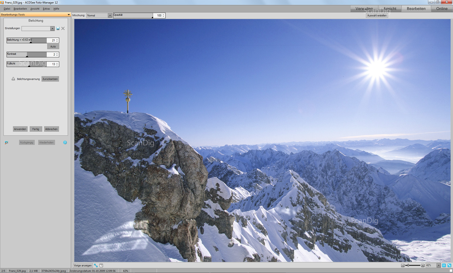 Der Modus Bearbeiten im ACDsee Foto-Manager bietet eine recht umfangreiche aber dennoch übersichtliche Palette der wichtigsten Werkzeuge und Funktionen zum pixelbasierten Optimieren und Bearbeiten der Bilder. Jede hier gemachte Veränderung kann rückgängig gemacht werden, solange das Bild noch nicht gespeichert wurde, auch mehrere Schritte zurück sind ohne Probleme möglich.