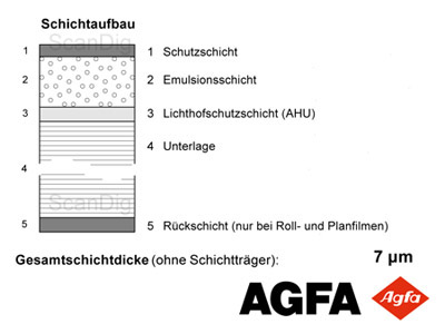 Der Agfa-Film besteht aus vier Hauptschichten. Die oberste Schicht ist die sogenannte Schutzschicht, sie soll den Film vor mechanischen Beschädigungen wie beispielsweise Kratzern schützen. Diese Schutzschicht ist eine Besonderheit von Agfa-Filmen, andere Hersteller bieten dieses Feature in der Regel nicht unbedingt an.