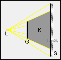 Licht breitet sich geradlinig aus. In nebenstehender Abbildung erkennt man Lichtstrahlen, die von der Lichtquelle L ausgesandt werden und auf einen Gegenstand G treffen. Hinter dem Gegenstand G bildet sich der sogenannte Kernschatten K. In diesen Bereich gelangt auf direktem Wege kein Lichtstrahl von der Lichtquelle L, so dass der entsprechende Bereich auf dem dahinter liegenden Schirm S theoretisch dunkel sein müsste. Ich sage deshalb theoretisch und habe auch den Kernschatten nicht schwarz sondern dunkelgrau gezeichnet, weil natürlich dennoch Licht durch Reflexion in den Bereich fällt. Sonst würde sich ja vor einem, wenn die Sonne von hinten scheint, ein rabenschwarzes Feld als Schatten auf der Straße bilden.