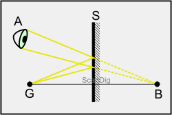 Betrachten wir nun als Beispiel für die Reflexion von Lichtstrahlen einen ebenen Spiegel, so wie wir ihn alle vom Badezimmer her kennen. Im Bild ist dieser Spiegel mit S bezeichnet. Von einem Gegenstand G aus treffen Lichtstrahlen auf diesen Spiegel und werden gemäß dem Reflexionsgesetz so reflektiert, dass der Ausfallswinkel gleich dem Einfallswinkel ist. Die reflektierten Lichtstrahlen fallen dann auf das Auge A des Betrachters, der in den Spiegel schaut. Im Bild sind diejenigen beiden Strahlen eingezeichnet, die das Auge gerade noch wahrnehmen kann.